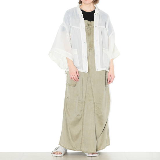 ビンテージ染めによる深みのある陰影と、レーヨン(モダール)特有のなめらかな肌触り・落ち感が魅力です。Tシャツやブラウスとのレイヤードはもちろん、同素材のC2423とのセットアップスタイルもおすすめ。後ろのタブでシルエットを調整できるデザインで、スタイリングに表情をプラスします。