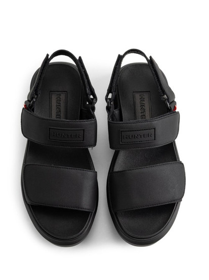 かかとのストラップはタッチアンドクローズ式で、フィット感の調節が可能です。チャンキーなアウトソールは軽量で、ソックスと合わせれば、春〜秋にかけて長く履けるのもポイント。ハンターのトリコロールカラータグ付き。