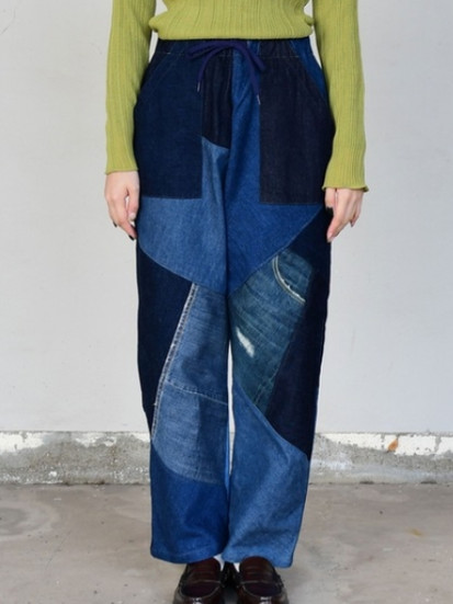 製品や古着、未使用の生地などを使用してパッチワークにしたイージーパンツ。ボリュームのあるワイドシルエットで、ウエストゴム仕様のためストレスフリーな穿き心地です。