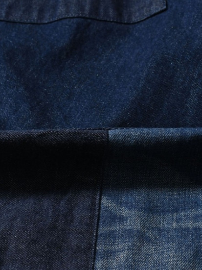 インパクトがある生地のため、デザイン自体はシンプルな仕様となっております。コントラストの効いたバリエーションがあるデニム使いがポイントです。一部にデニムを解体した生地を使用しており、随所にその名残を感じられるアイテムとなっております。