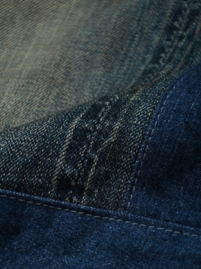 こちらはデニムのルーツである作業用アイテムとして活躍していた時代の、ややハードなダメージ感をあて布処理を施して穿きやすさを表現した加工を施しています。長年着込んだような自然な色落ちを表現したカラーです。
