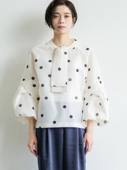 ハリのあるシアー素材にドットがプリントされたプルオーバー型のトップスブラウス。