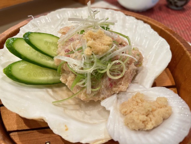 この日はとにかく美味しいお刺し身が食べたかったので、刺盛りと行ったら必ず頼む、おやじ任せと、なめろう➕つぶ刺しです👌
